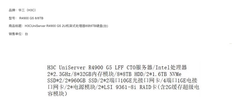 商品名称: H3C UniServer R4900 G5 2U机架式服务器 配置2个Intel(2.3GHz/20核/30MB/150W)处理器和8块8TB HDD硬盘