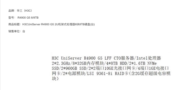 商品名称: H3C UniServer R4900 G5 2U机架式服务器 配置2个Intel(2.3GHz/20核/30MB/150W)处理器和4块8TB HDD硬盘