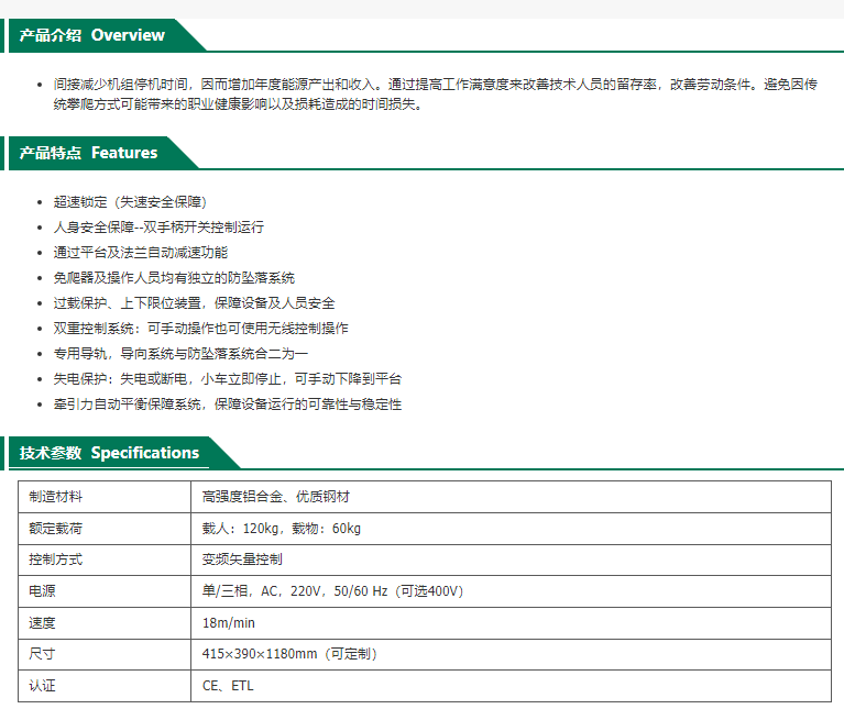 3S LIFT 风电塔筒专用微型升降机,免爬器,专用安全升降设备,CF-120D