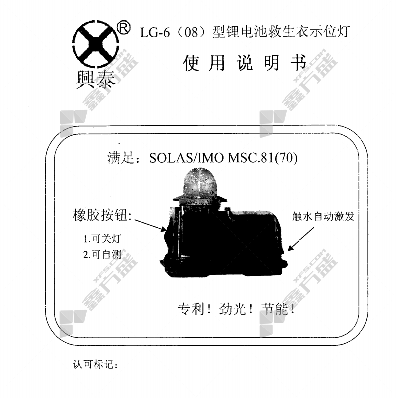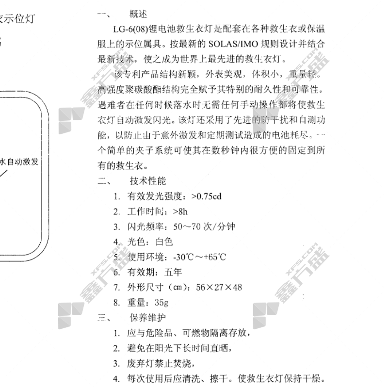 商品名称: 兴泰 救生衣灯 LG-6(08) 有效发光强度:>0.75cd,工作时间:>8h,闪光频率:50~70次/分钟,光色:白色 黄色