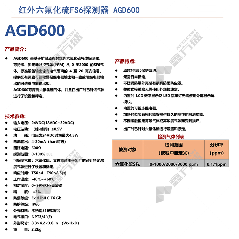 商品名称: 安润威 红外六氟化硫FS6探测器 AGD600